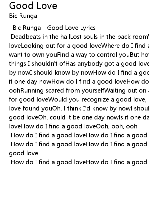 Deadbeats in the hallLost souls in the back roomWhere do I find a good loveLooking out for a good loveWhere do I find a good love round hereRich men want to own youFind a way to control youBut how do I find a good loveLooking for things I shouldn't ofHas anybody got a good love right hereOh, I think I'd know by nowI should know by nowHow do I find a good loveOh, could it be one day nowIs it one day nowHow do I find a good loveHow do I find a good loveOoh, ooh, oohRunning scared from yourselfWaiting out on a bad moonBut is there still time for good loveWould you recognize a good love, good loveIf even by chance a good love found youOh, I think I'd know by nowI should know by nowHow do I find a good loveOh, could it be one day nowIs it one day nowHow do I find a good loveHow do I find a good loveOoh, ooh, ooh |