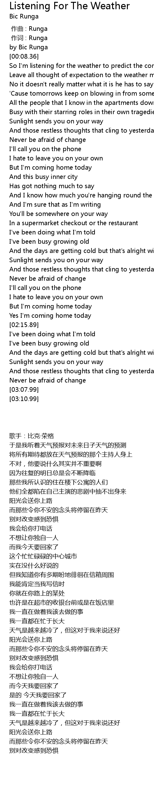 | [00:10.86] | So I' m listening for the weather to predict the coming day |