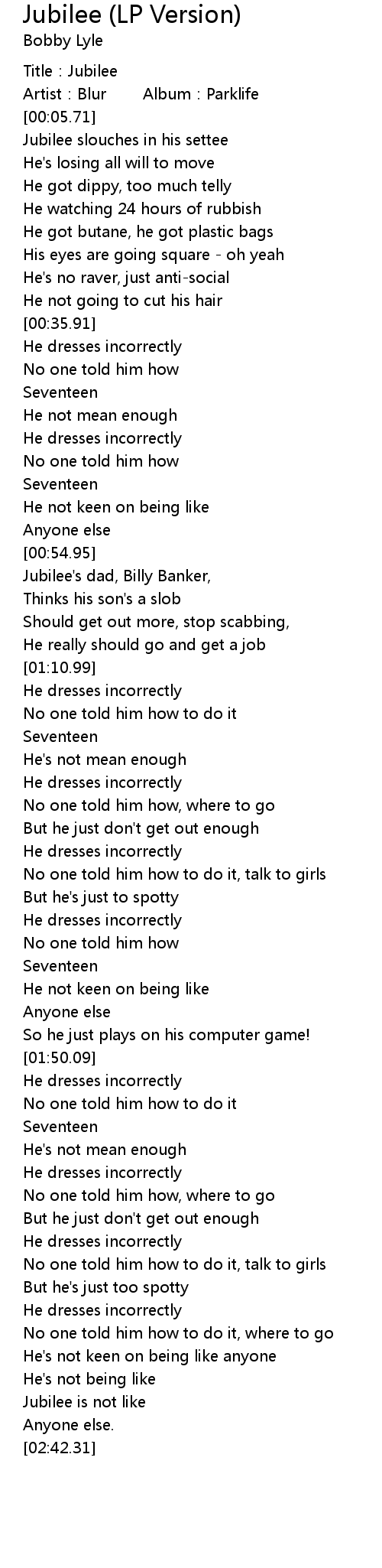 | [01:19.64] | He dresses incorrectly |