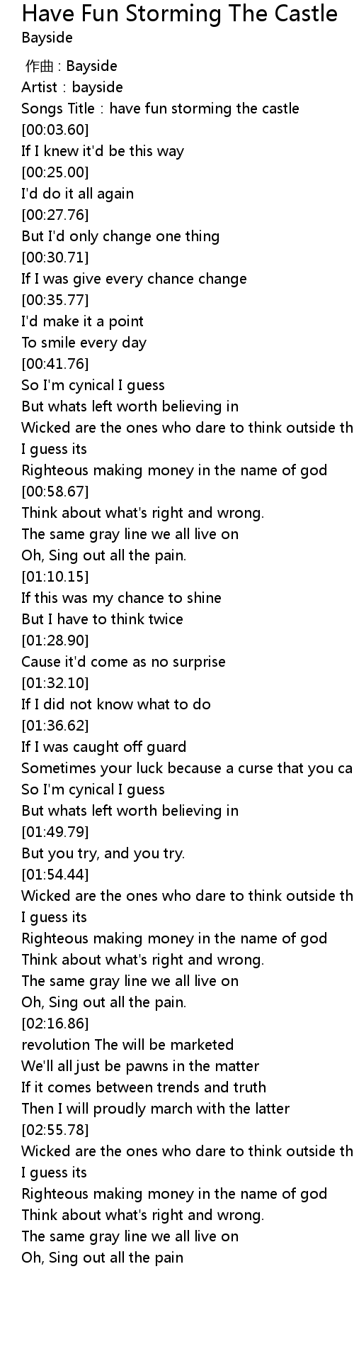 | [00:01.39] | Songs Title: have fun storming the castle |
