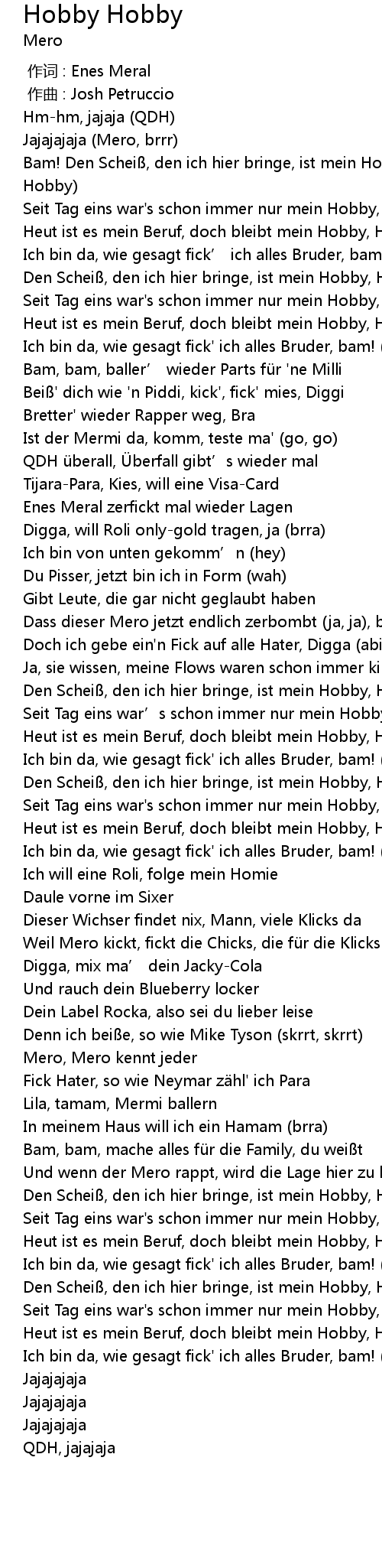 | [00:58.85] | Den Scheiß, den ich hier bringe, ist mein Hobby, Hobby (Hobby, Hobby) |