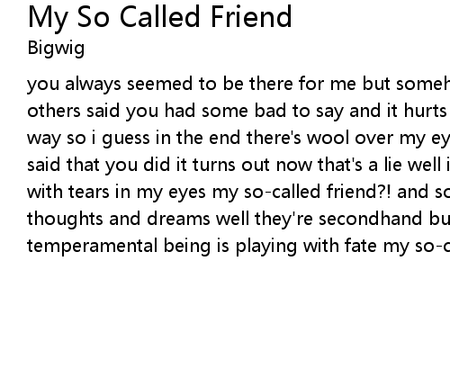 you always seemed to be there for me but somehow it seemed so superficial some others said you had some bad to say and it hurts me to think that you felt that way so i guess in the end there's wool over my eyes you said that you cared you said that you did it turns out now that's a lie well i'm not surprised just left with tears in my eyes my so-called friend?! and so i don't understand your thoughts and dreams well they're secondhand but when will we end this game your temperamental being is playing with fate my so-called friend?! |