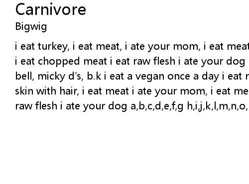 | i eat turkey, i eat meat, i ate your mom, i eat meat, i ate your dad, i eat meat i eat chopped meat i eat raw flesh i ate your dog i eat a vegan every day taco bell, micky d's, b.k i eat a vegan once a day i eat raw meat, i eat meat i eat skin with hair, i eat meat i ate your mom, i eat meat i eat chopped meat i eat raw flesh i ate your dog a,b,c,d,e,f,g h,i,j,k,l,m,n,o,p q,r,s,t,u,v w,x m.e.a.t |