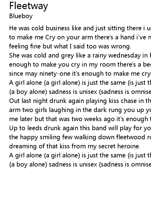 | A girl alone (a girl alone) is just the same (is just the same) as a boy alone (a boy alone) sadness is unisex (sadness is omnisex) | |
