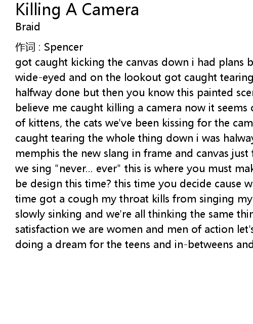 | got caught kicking the canvas down i had plans but they never seemed to work out wideeyed and on the lookout got caught tearing the whole thing down i was halfway done but then you know this painted scene could never leave me oh please believe me caught killing a camera now it seems calming and clear to hire a cast of kittens, the cats we' ve been kissing for the cameras we' re lowering here got caught tearing the whole thing down i was halway done but then we sang it for memphis the new slang in frame and canvas just for the cameras when we are awake we sing " never... ever" this is where you must make up your mind should beauty be design this time? this time you decide cause we go with whatever we take our time got a cough my throat kills from singing my ears are ringing the stage is slowly sinking and we' re all thinking the same thing let' s not settle for satisfaction we are women and men of action let' s stop clapping let' s start doing a dream for the teens and inbetweens and twenties yet unseen. |