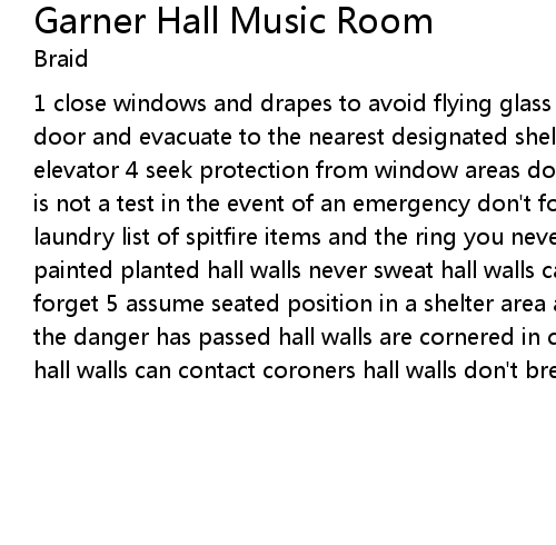 1 close windows and drapes to avoid flying glass and water damage 2 close room door and evacuate to the nearest designated shelter area 3 do not use the elevator 4 seek protection from window areas do not go outside the building this is not a test in the event of an emergency don't forget to salvage the scene a laundry list of spitfire items and the ring you never wear hall walls are painted planted hall walls never sweat hall walls can manage damage but we never forget 5 assume seated position in a shelter area and await notification that the danger has passed hall walls are cornered in corners hall walls stay staked hall walls can contact coroners hall walls don't break |