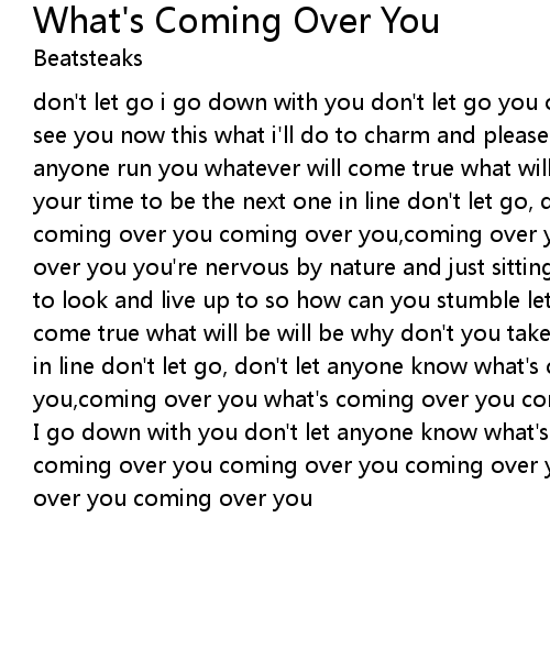don't let go i go down with you don't let go you offer and feature let anyone see you now this what i'll do to charm and please you so how can you stumble let anyone run you whatever will come true what will be will be why don't you take your time to be the next one in line don't let go, don't let anyone know what's coming over you coming over you,coming over you what's coming over you coming over you you're nervous by nature and just sitting next to a love and a statue to look and live up to so how can you stumble let anyone run you whatever will come true what will be will be why don't you take your time to be the next one in line don't let go, don't let anyone know what's coming over you coming over you,coming over you what's coming over you coming over you don't let go |