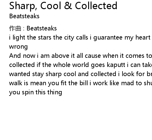 | And now i am above it all cause when it comes to love i stay sharp, cool and collected if the whole world goes kaputt i can take it and i get all i ever wanted stay sharp cool and collected i look for brains you got the skills your walk is mean you fit the bill i work like mad to shuck and jive no matter how you spin this thing |
