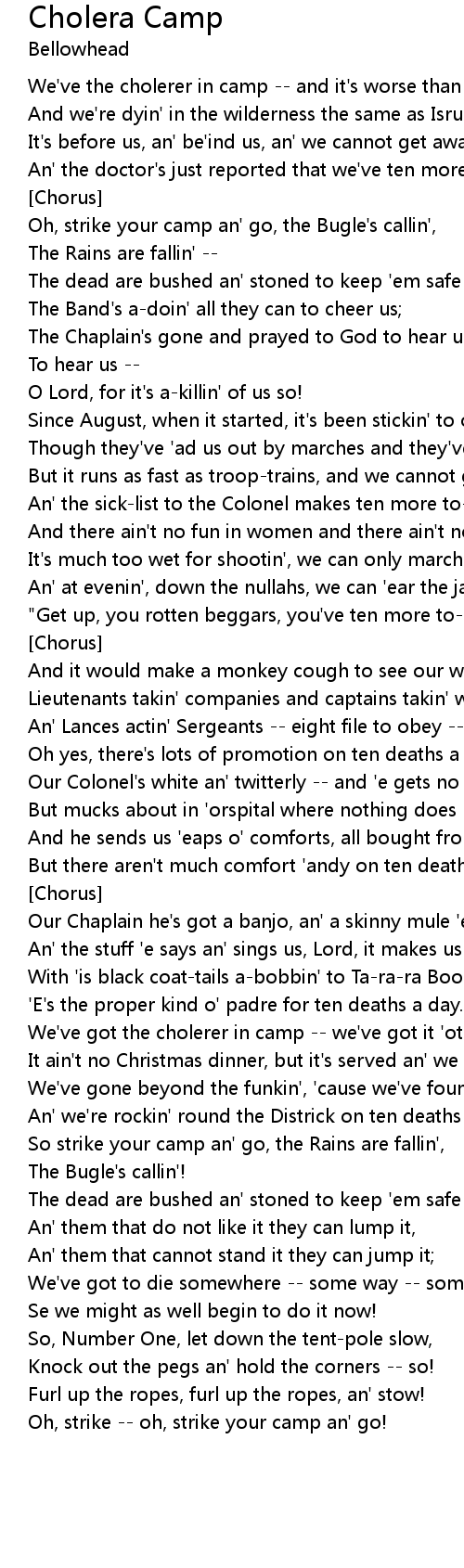We've got the cholerer in camp -- we've got it 'ot an' sweet; |