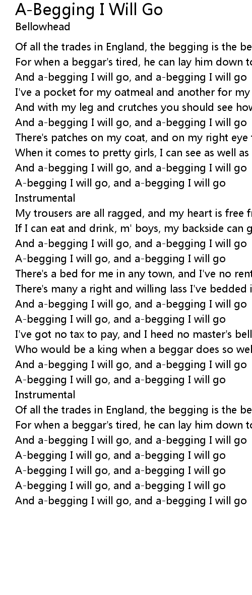 A-begging I will go, and a-begging I will go |