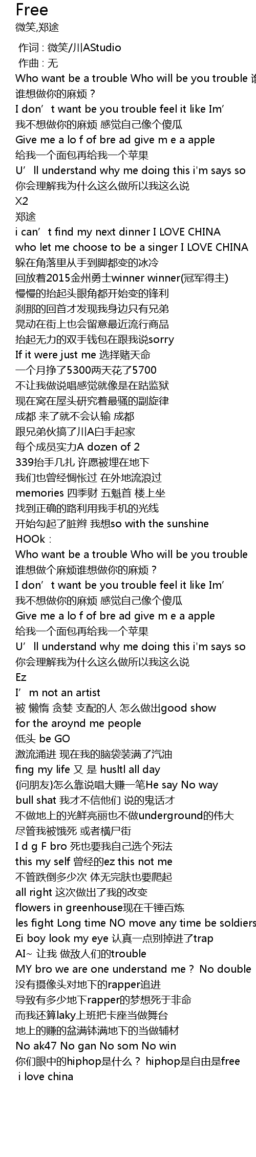 | [02:43.70] | nǐ men yǎn zhōng de hiphop shì shén me? hiphop shì zì yóu shì free |
