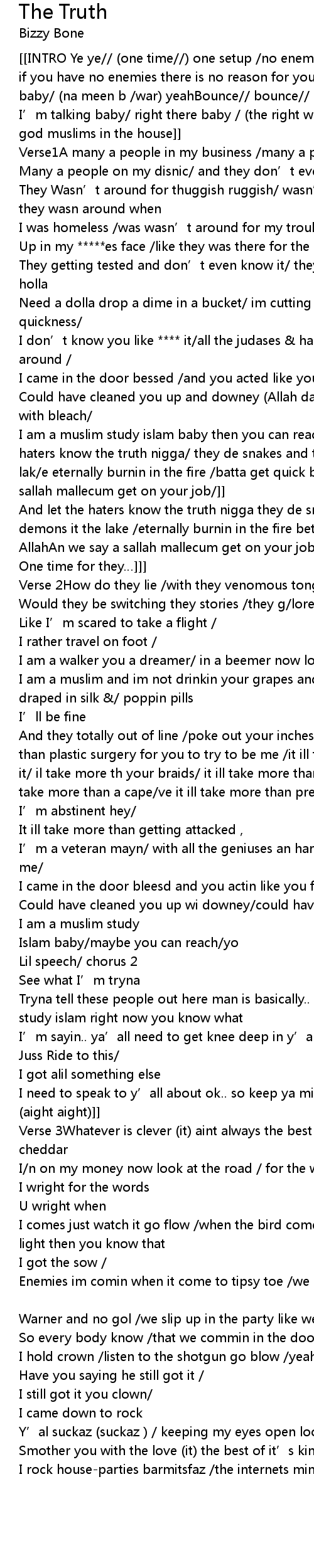 | I am a muslim study islam baby then you can reach Chorus hook 1 And let the haters know the truth nigga they de snakes and they gone be the demons it the lak e eternally burnin in the fire batta get quick back to god allahAn we say a sallah mallecum get on your job | |