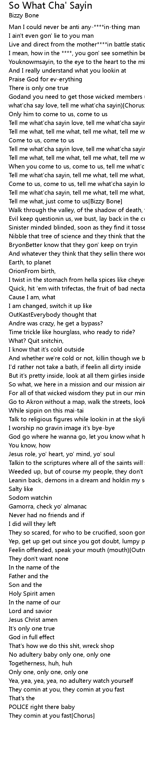 Godand you need to get those wicked members up off of him...(Come to us, tell me what'cha say love, tell me what'cha sayin)[Chorus: Bizzy Bone] |