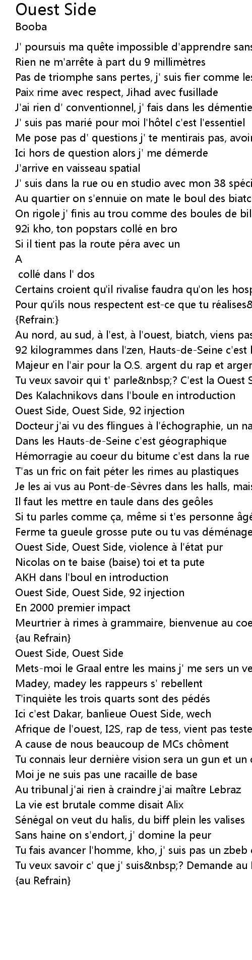 | Tu veux savoir qui t' parle nbsp? C' est la Ouest Side nbsp! Ouest Side nbsp! | |