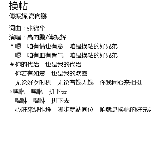 | 心肝来绑作堆 脚步就站同位 咱就是换帖的好兄弟 |