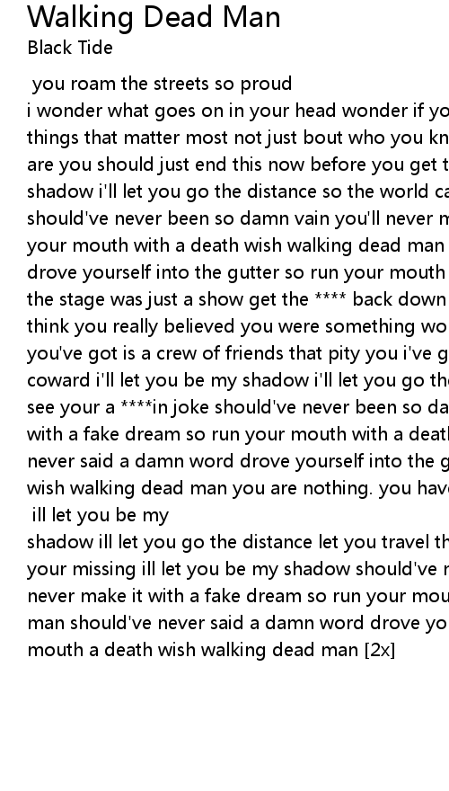 you have no heart, no mind of your own [Gabe solo] you roam the streets so proud i wonder what goes on in your head wonder if you've ever thought about the things that matter most not just bout who you know or about who you think you are you should just end this now before you get taken out i'll let you be my shadow i'll let you go the distance so the world can see your a ****in joke should've never been so damn vain you'll never make it with a fake dream so run your mouth with a death wish walking dead man should've never said a damn word drove yourself into the gutter so run your mouth a death wish walking dead man the stage was just a show get the **** back down to earth now i'm beginning to think you really believed you were something worthy of fame the only thing you've got is a crew of friends that pity you i've got no pity for a ****in coward i'll let you be my shadow i'll let you go the distance so the world can see your a ****in joke should've never been so damn vain you'll never make it with a fake dream so run your mouth with a death wish walking dead man should've never said a damn word drove yourself into the gutter so run your mouth a death wish walking dead man you are nothing. you have no one you have no heart, no mind of your own. you have no mind of your own [Gabe solo] ill let you be my shadow ill let you go the distance let you travel the world so you can see what your missing ill let you be my shadow should've never been so damn vain you'll never make it with a fake dream so run your mouth with a death wish walking dead man should've never said a damn word drove yourself into the gutter so run your mouth a death wish walking dead man |