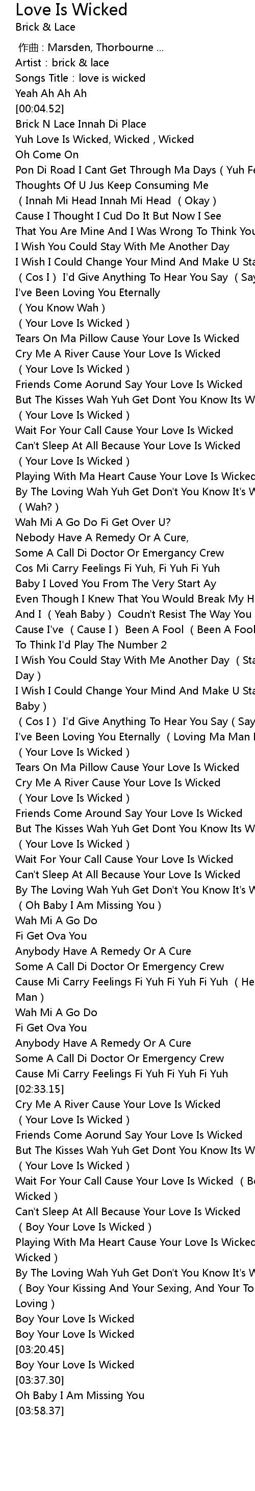 | [03:08.92] | Playing With Ma Heart Cause Your Love Is Wicked Boy Your Love Is Wicked |