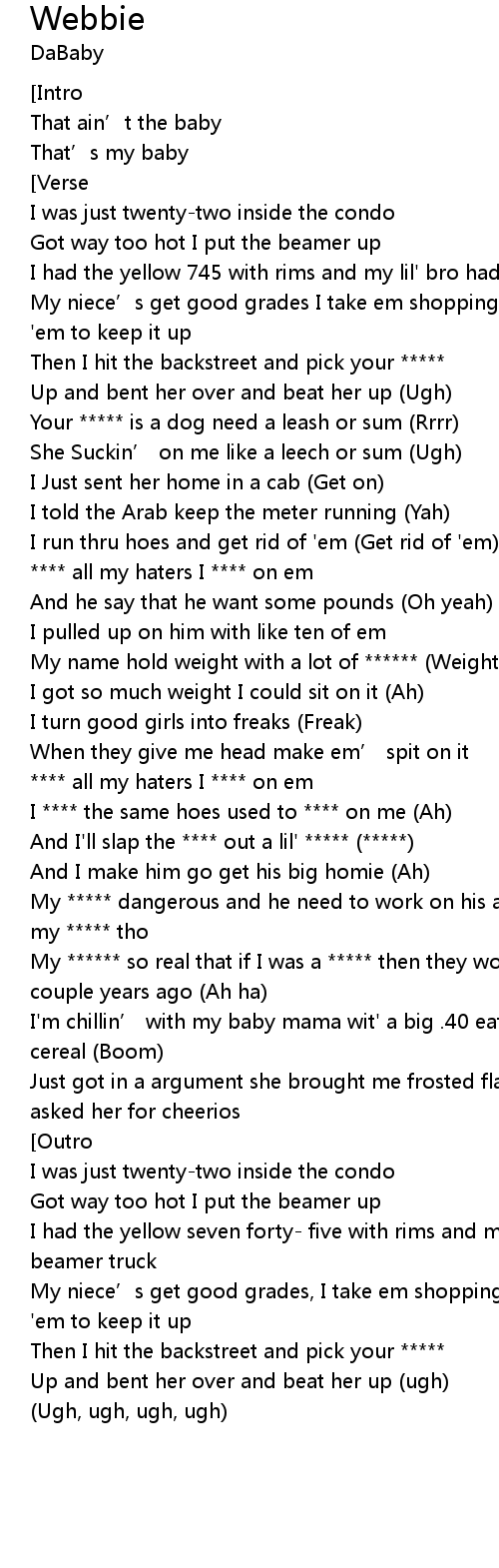 | [00:31.334] | She Suckin’ on me like a leech or sum (Ugh) |