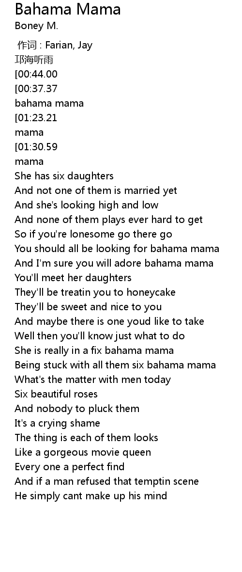 | [00:40.84][01:30.59][02:36.86][03:06.17] | But her trouble's getting down bahama mama |
