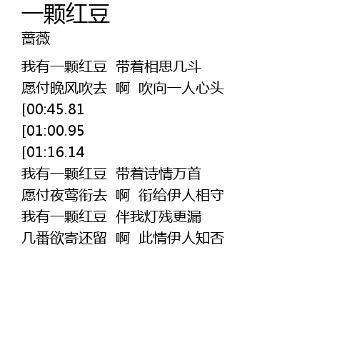 | [02:30.83][00:45.81] | 我有一颗红豆 小巧玲珑剔透 |
