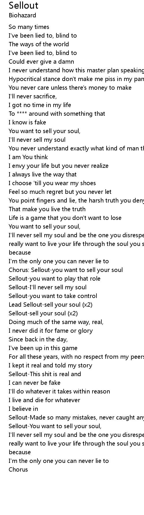 I'll never sell my soul and be the one you disrespect and lie to the one you really want to live your life through the soul you sell is really your own because |