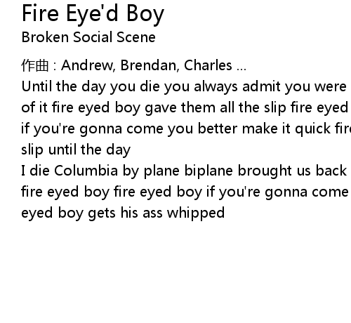 | I die Columbia by plane biplane brought us back back to life drifted off again fire eyed boy fire eyed boy if you' re gonna come you better make it quick fire eyed boy gets his ass whipped |