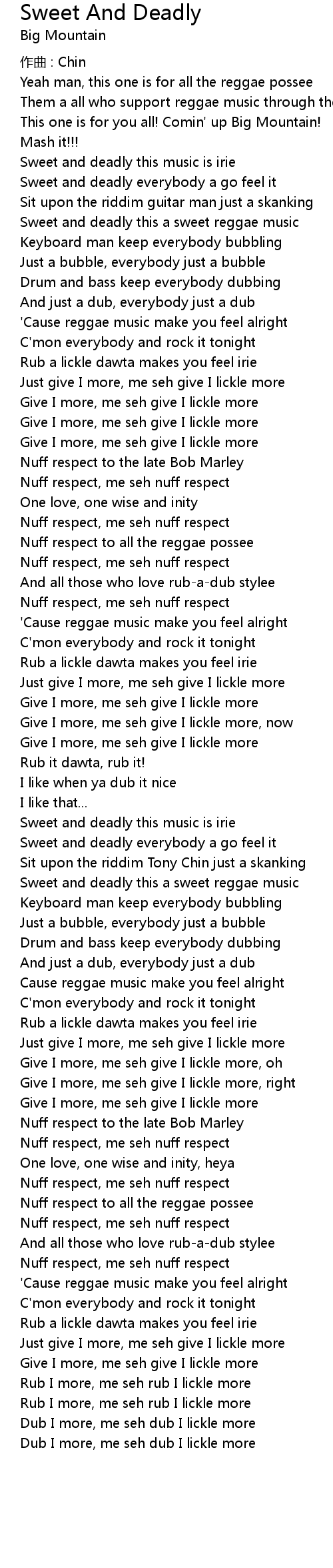 | Sweet and deadly this music is irie | |