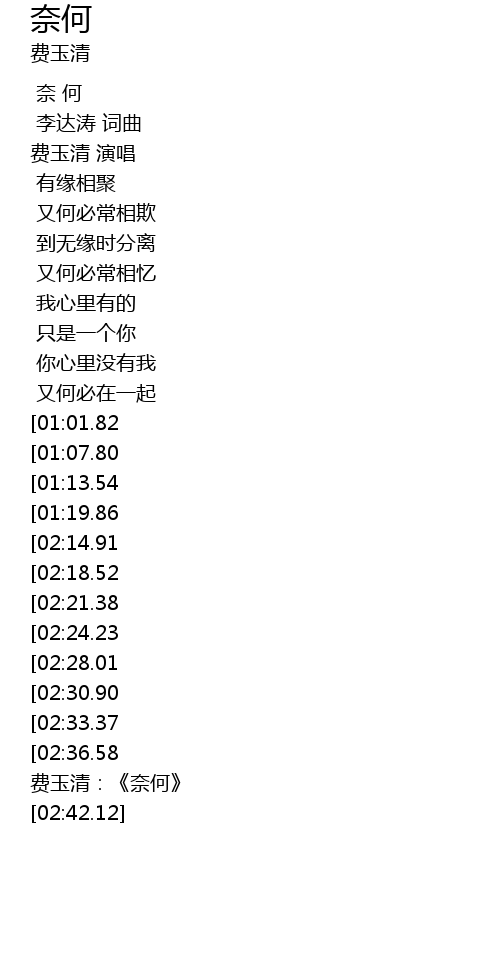 | [01:55.30] | 费玉清:《奈何》 |