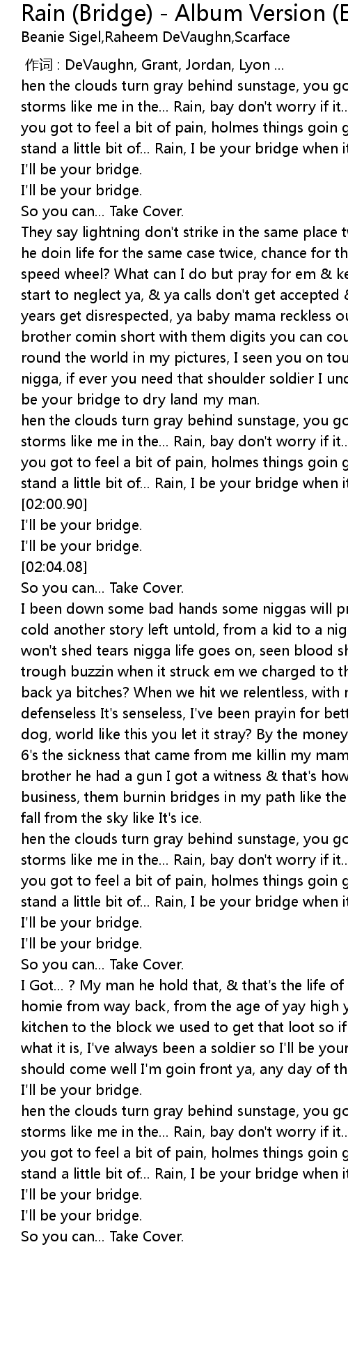 | [01:37.67] | hen the clouds turn gray behind sunstage, you got to experience the storms like me in the... Rain, bay don't worry if it... Rains, To experience joy you got to feel a bit of pain, holmes things goin get better tell me can you stand a little bit of... Rain, I be your bridge when it... Rains. |