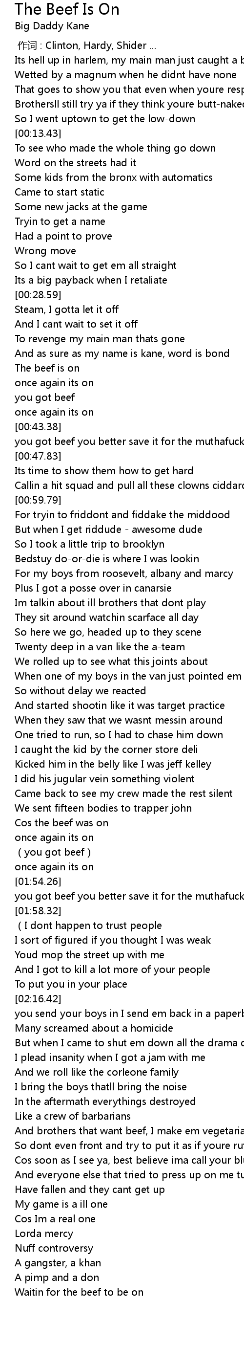 | [01:48.83] | Cos the beef was on |