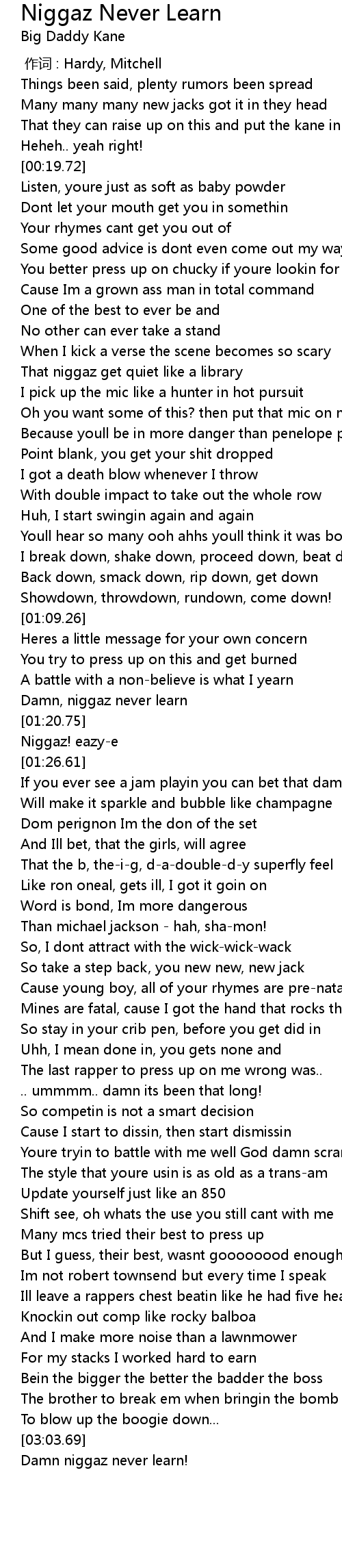 | [01:19.56] | Damn, niggaz never learn |