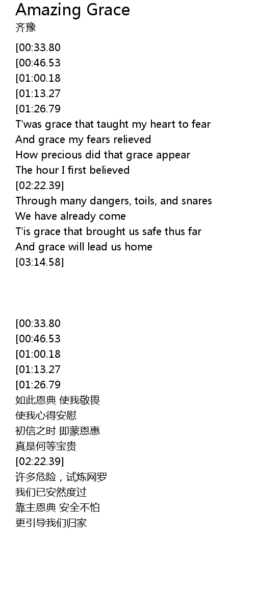 | [03:15.31][00:33.80] | Amazing Grace, how sweet the sound |