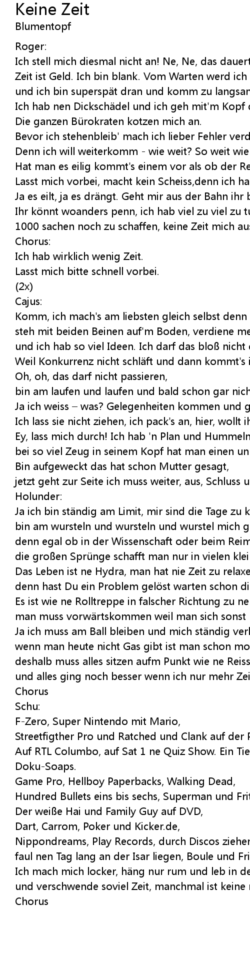 | Lasst mich vorbei, macht kein Scheiss,denn ich hab keine Zeit. | |