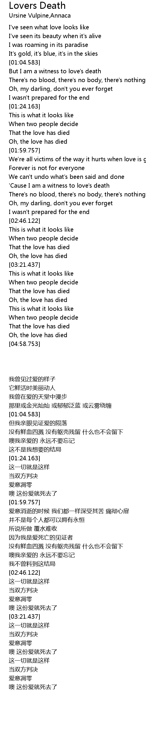 | [01:08.844] | But I am a witness to love's death |