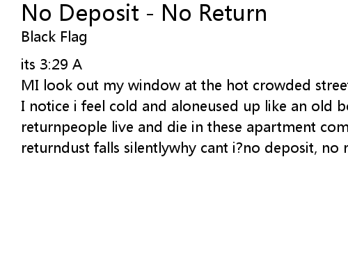 | I notice i feel cold and aloneused up like an old bottleno deposit, no returnpeople live and die in these apartment compartmentsno deposit, no returndust falls silentlywhy cant i?no deposit, no return |