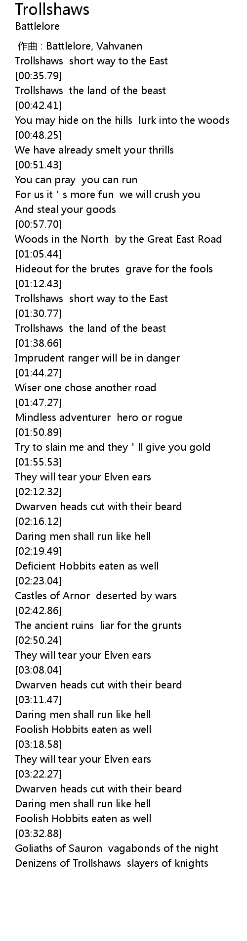 | [03:53.35] | Denizens of Trollshaws slayers of knights |