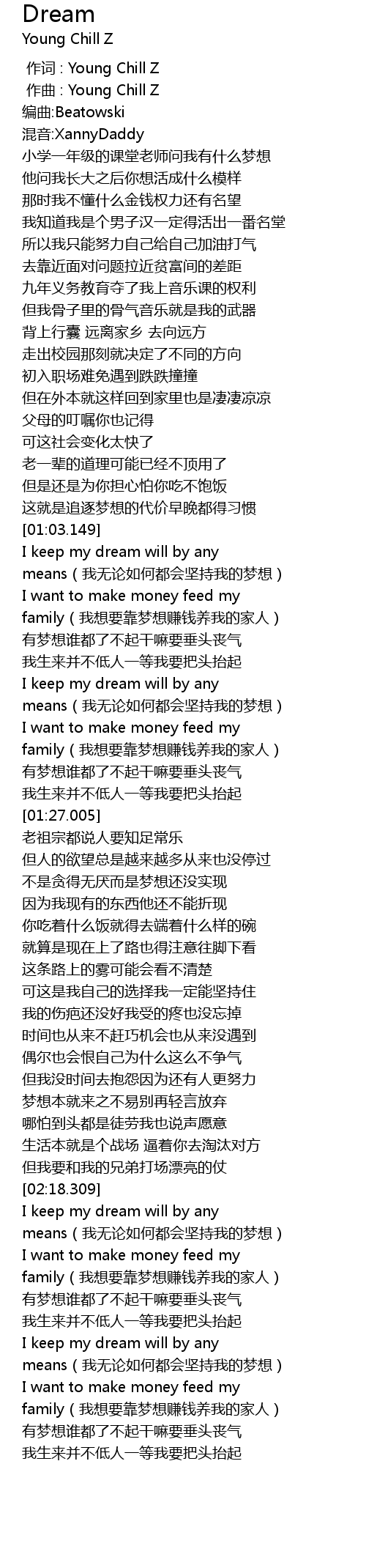 | [02:33.325] | I want to make money feed my family wǒ xiǎng yào kào mèng xiǎng zhuàn qián yǎng wǒ de jiā rén |