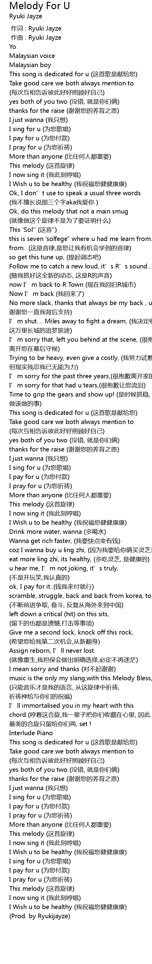 | [01:58.161] | music is the only my slang,with this Melody Bless,from god, (只能音乐才是我的语言, 从这旋律中祈祷, 祈祷神给与你们的祝福) |