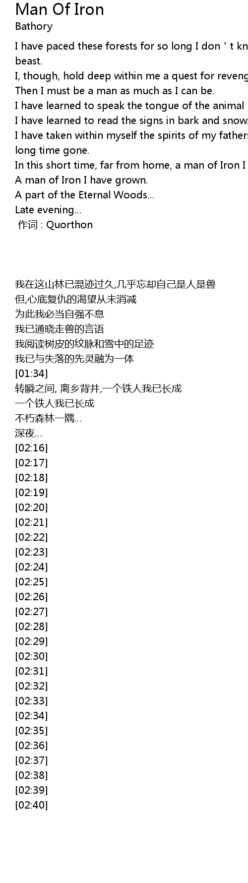 | [01:40] | In this short time, far from home, a man of Iron I've grown. |