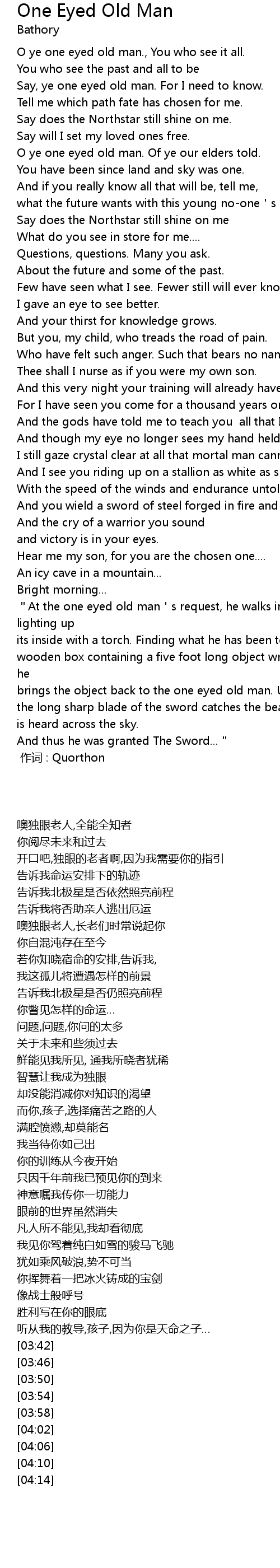 | [01:14] | O ye one eyed old man. Of ye our elders told. |