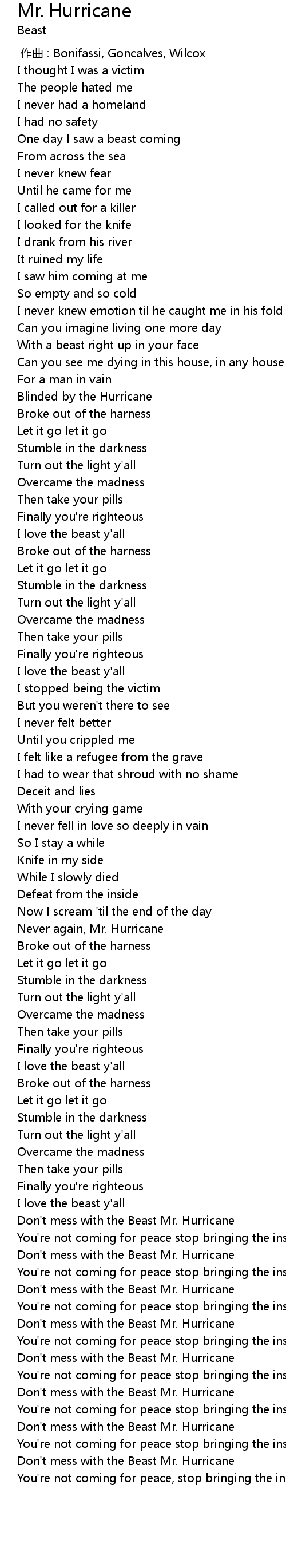 | [02:40.000] | Don' t mess with the Beast Mr. Hurricane |