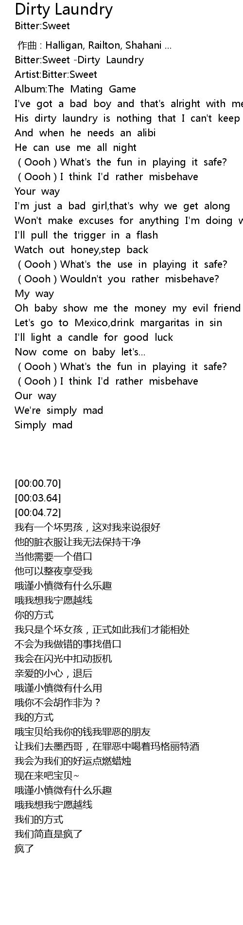 | [00:00.70] | Bitter:Sweet -Dirty Laundry |