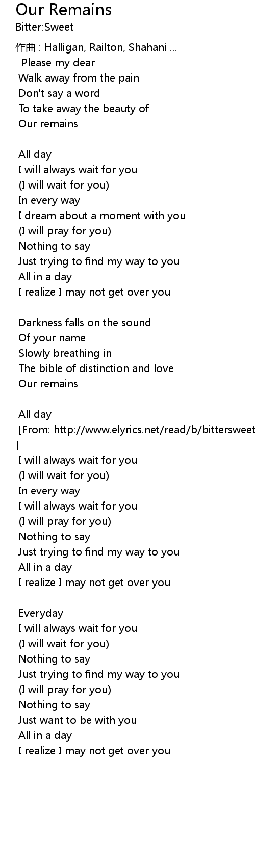 | [From: http://www.elyrics.net/read/b/bittersweet-lyrics/our-remains-lyrics.html ] | |