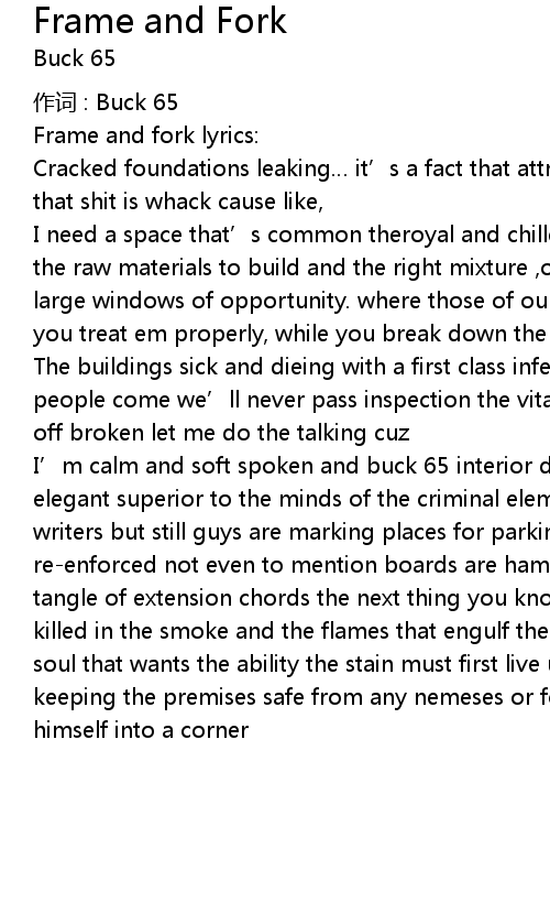 | The buildings sick and dieing with a first class infection if the health board people come we' ll never pass inspection the vital sides been neglected calling off broken let me do the talking cuz | |