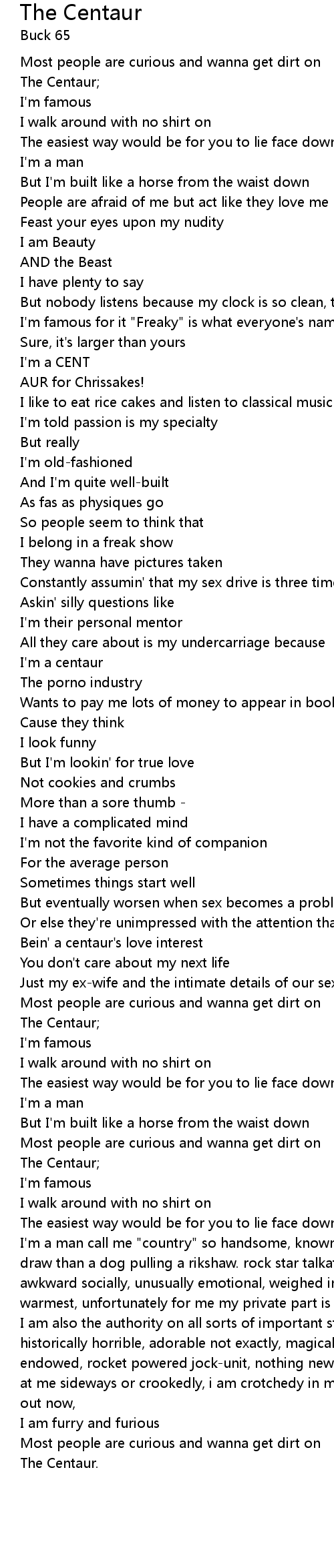 | I am also the authority on all sorts of important stuff morally the centaur historically horrible, adorable not exactly, magically attractive, drastically endowed, rocket powered jock-unit, nothing new to talk about it, don't even look at me sideways or crookedly, i am crotchedy in more ways than one, macho, watch out now, | |