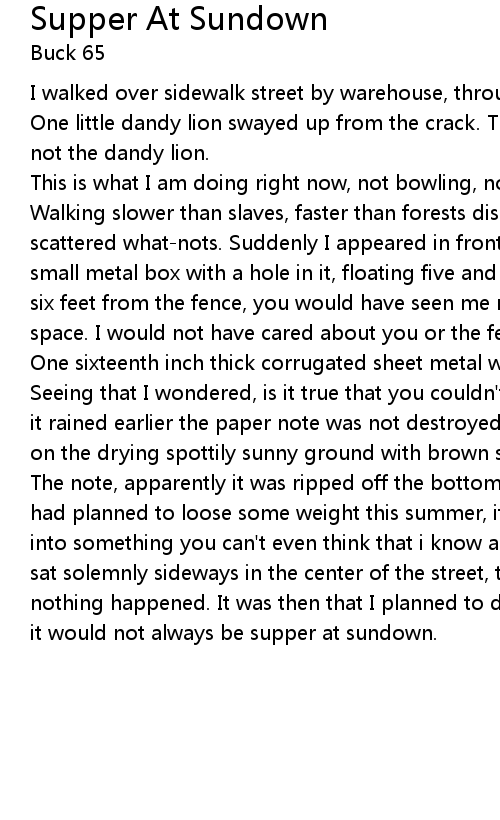 This is what I am doing right now, not bowling, not standing on your face. Walking slower than slaves, faster than forests disappear. Damp cardboard scattered what-nots. Suddenly I appeared in front of the fence. If you were a small metal box with a hole in it, floating five and a half feet off the ground, six feet from the fence, you would have seen me motion by through time and space. I would not have cared about you or the fence. It was eight feet tall. One sixteenth inch thick corrugated sheet metal with a gray primer finish. Seeing that I wondered, is it true that you couldn't find the scissors? Although it rained earlier the paper note was not destroyed. Part of a note that I found on the drying spottily sunny ground with brown skies over it and a spot of sun. The note, apparently it was ripped off the bottom of a letter by a parent. She had planned to loose some weight this summer, it said. I thought about making it into something you can't even think that i know about. The broken down swing set sat solemnly sideways in the center of the street, tipped over. And suddenly nothing happened. It was then that I planned to dissemble myself and I new that it would not always be supper at sundown. |