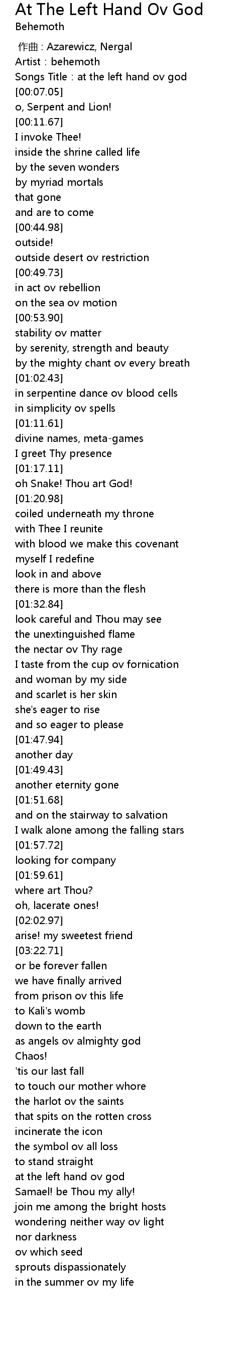 | [00:03.87] | Songs Title:at the left hand ov god |