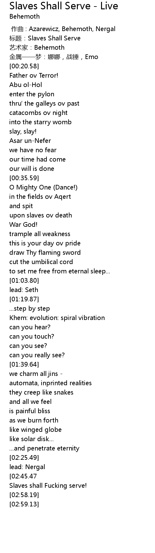 | [02:43.78][02:45.47][02:47.33][02:49.00][02:50.89][02:52.54] | Slaves shall serve! |
