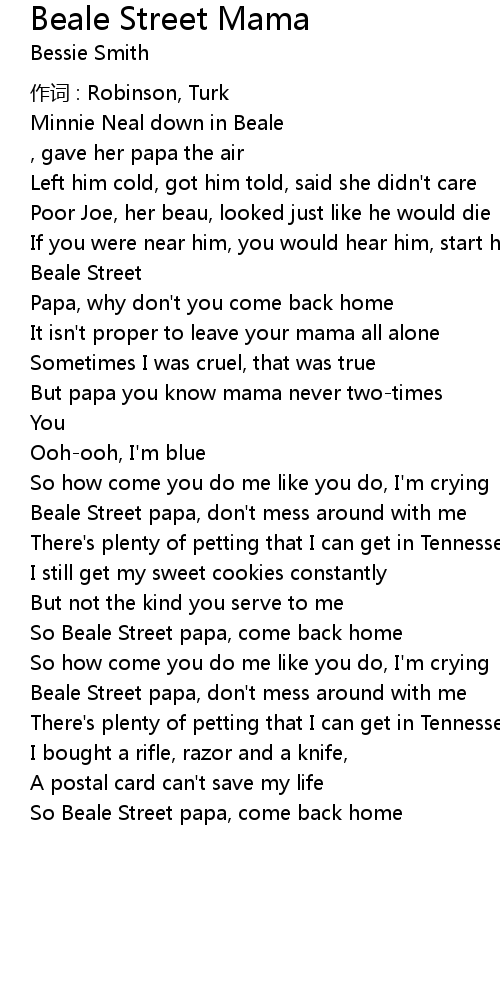 | So Beale Street papa, come back home | |