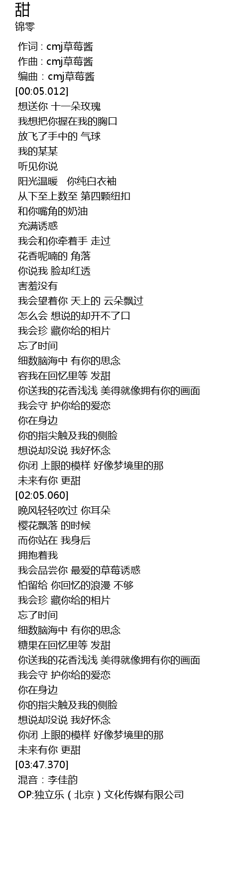 | [00:03.128] | 编曲:cmj草莓酱 |